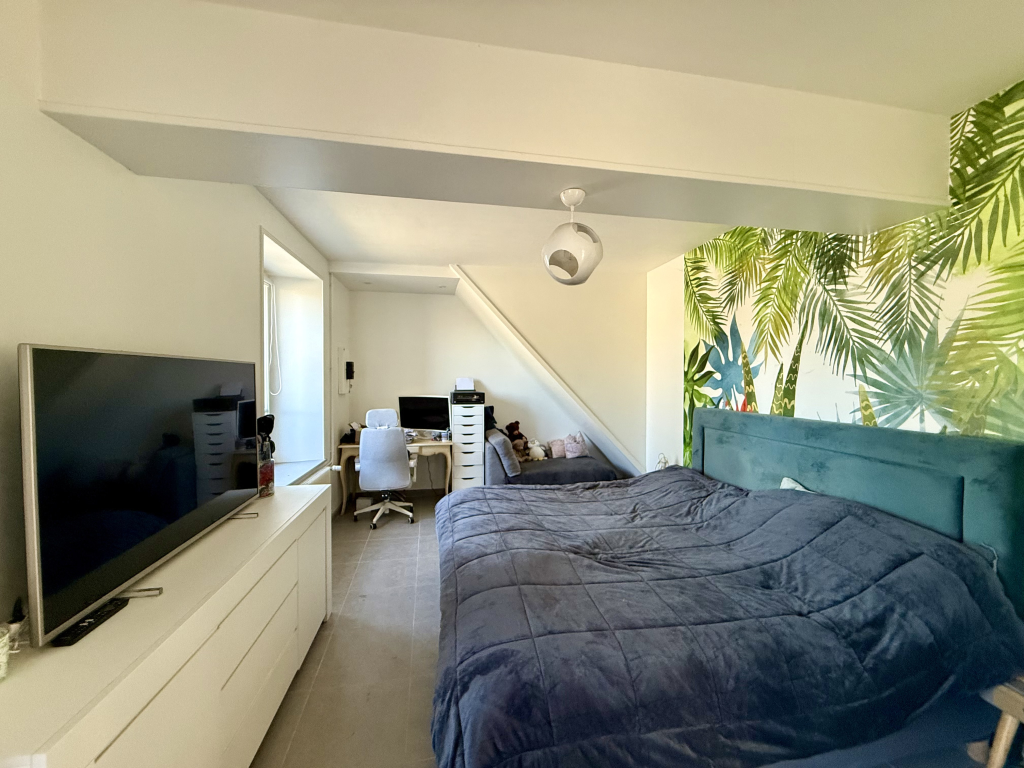 À l’étage, un palier dessert deux chambres, un bureau, une salle de bains et un WC. Un second escalier mène à une quatrième chambre ainsi qu’à un grenier.