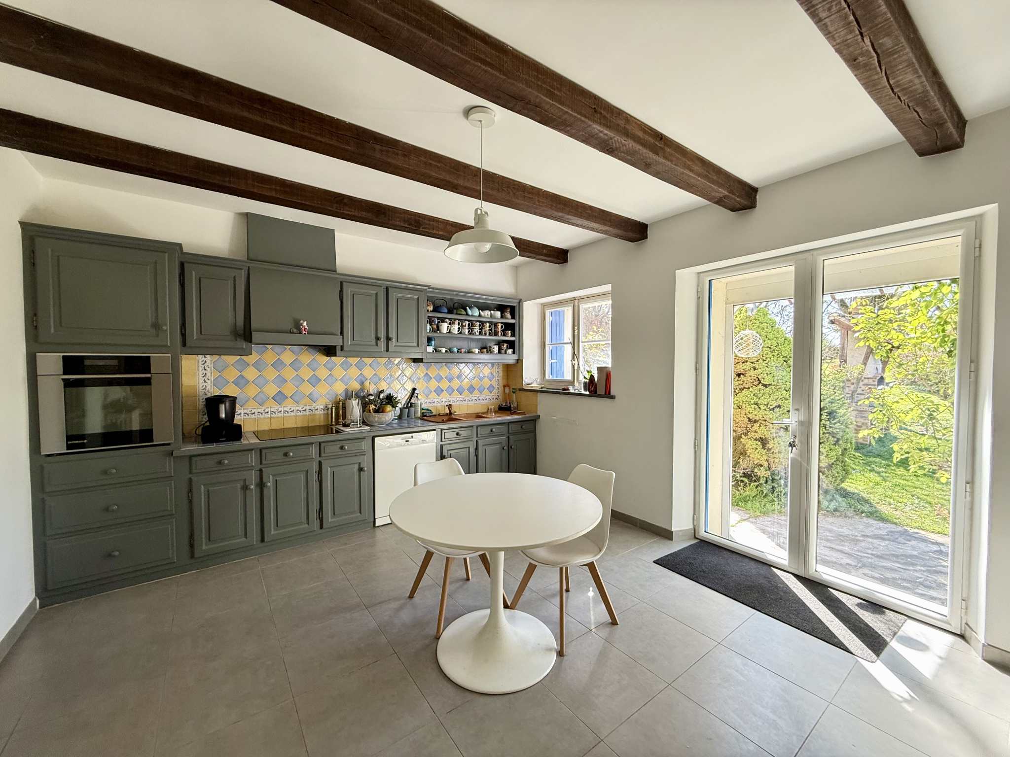 À l’extérieur, vous profiterez d’une agréable terrasse exposée plein sud, d’un grand garage de plus de 50 m², de plusieurs dépendances et d’une cave.
