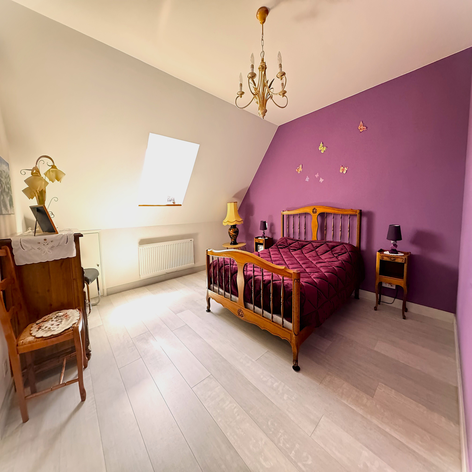 À l’étage, une pièce palière dessert trois chambres, dont une suite parentale ainsi qu’un second WC.