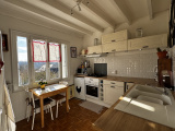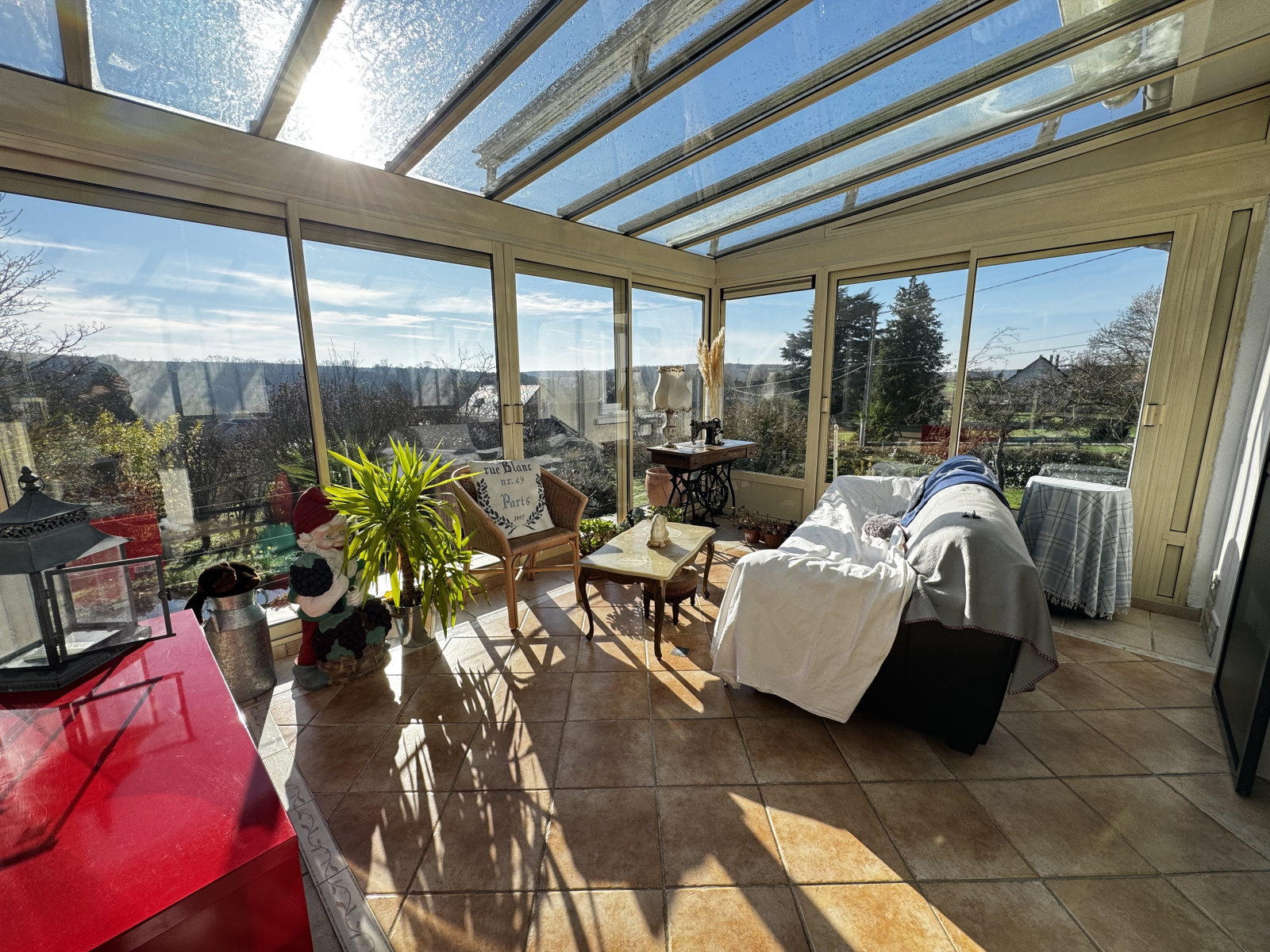 Elle se compose d’une pièce de vie chaleureuse avec salon-séjour et poêle à bois, ouverte sur une véranda lumineuse avec vue dégagée, ainsi qu’une cuisine aménagée et équipée. Le rez-de-chaussée dispose également d’une salle d’eau et d’un WC indépendant.