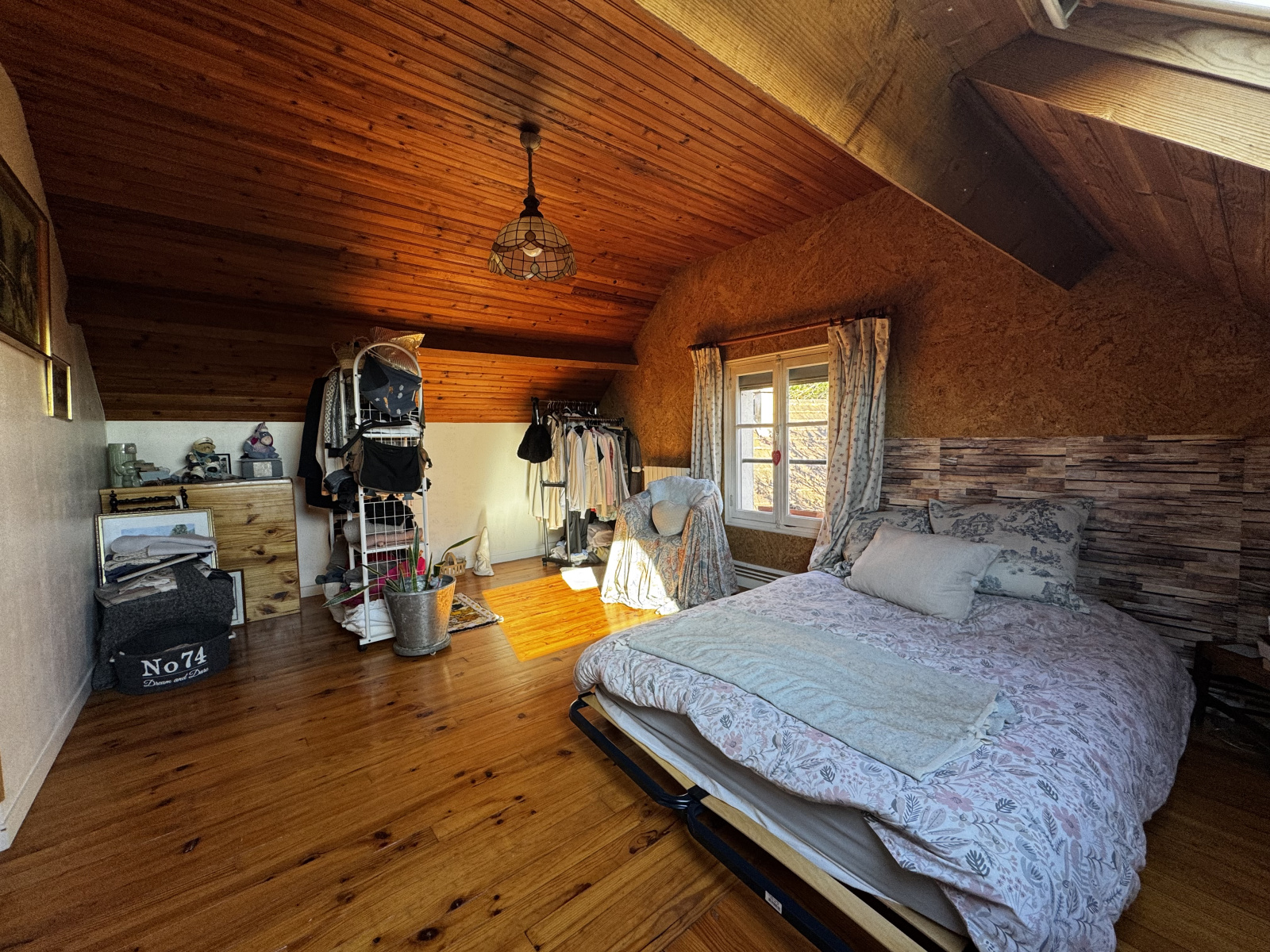 À l’étage, un palier dessert deux chambres, dont une avec point d’eau. À l’extérieur, le terrain clos permet de profiter pleinement des beaux jours, complété par un garage d’environ 23 m² avec grenier, idéal pour le stationnement et le stockage ou projet d'aménagement.